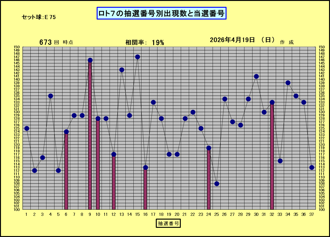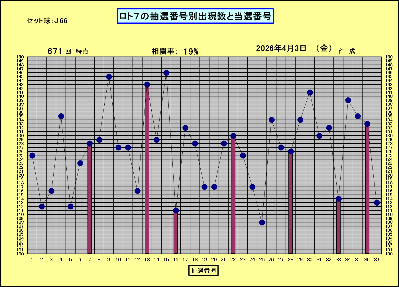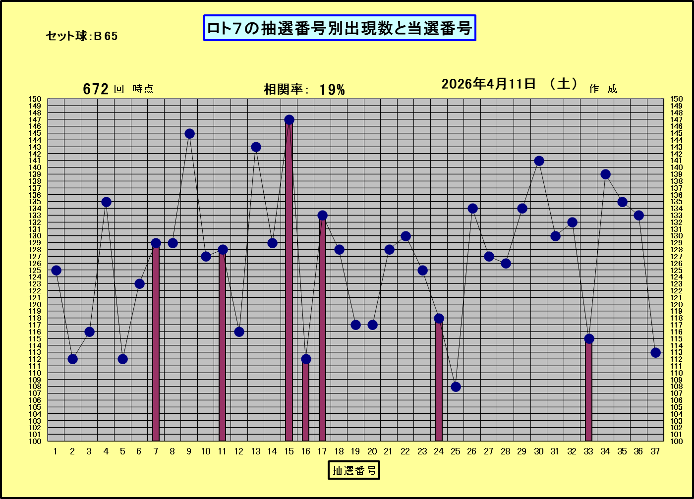 ◆ロト7の抽選番号別出現回数と当回の当選番号◆